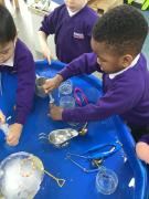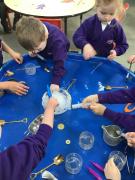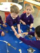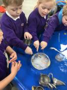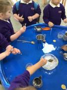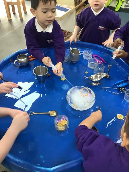 It has been a week of finding treasure this week. The children came in on Wednesday to discover that Pirate Pam has stolen Pirate Pete's treasure and frozen it! The children worked together to try and free the treaure from the ice and discussed how we needed to melt the ice to get the treasure out. They used warm water, syringes and brushes to try and melt the ice.We even tried little spades to chip away at the ice. You will be pleased to know that we got all of Pirate Pete's treasure back for him!