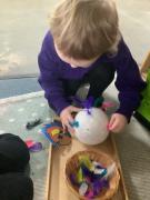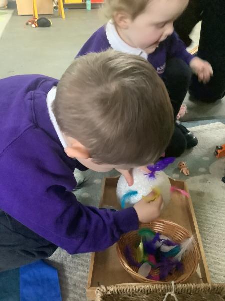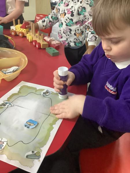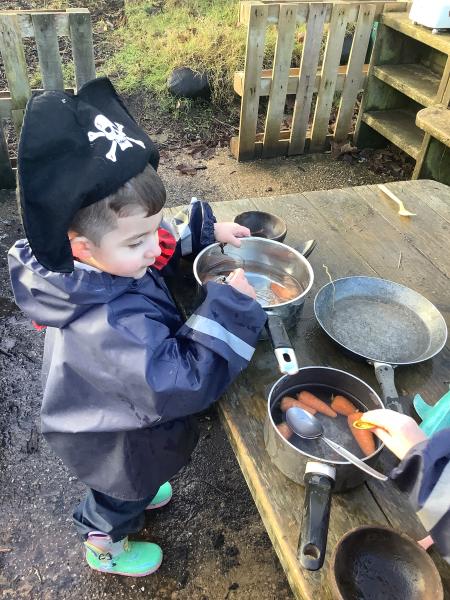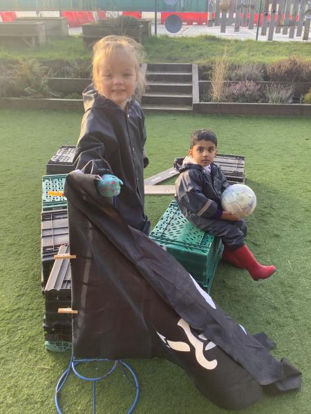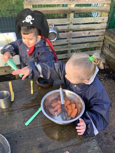Nursery have become Pirates! We have read the story "Don't disturb the Pirates" and leanrt all about treausre hunts, ship wrecks, walking the plank and maps. The children created their own maps and discussed where they placed the key features using prepositions. They also counted golden coins, made pirate soup. For physical development the children moved large bricks and crates to make a pirate ship and even walked the plank!
