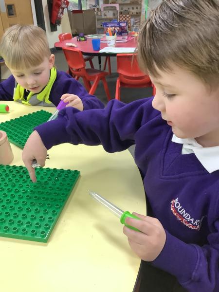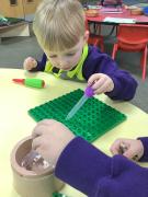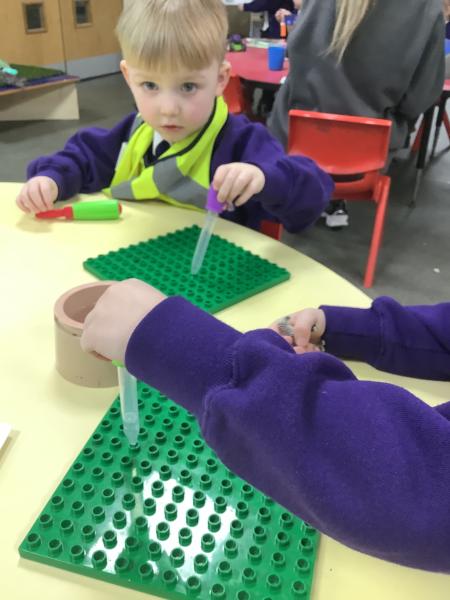 We are working hard to build up our finger strength in Nursery to help us develop a strong pencil grip. This weeks challenge - to fill the tiny holes on a Duplo board with water using a pipette! It took skill, concentration and a lot of patience. the children rose to the challenge and became very skilled at filling the tiny holes! We will have the strongest fingers in the whole of Blackpool!