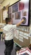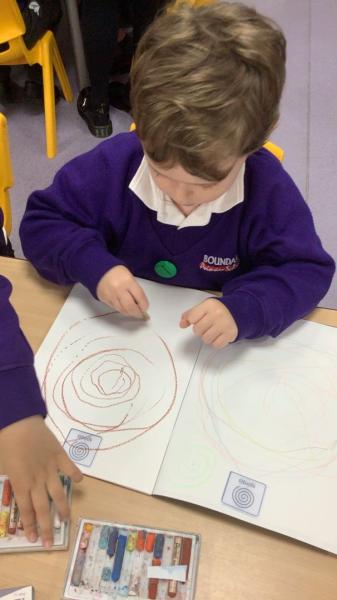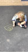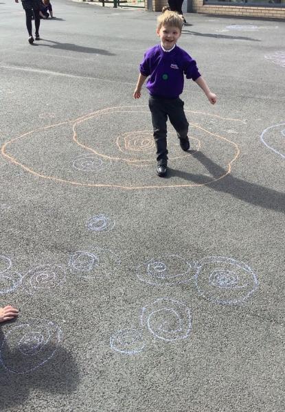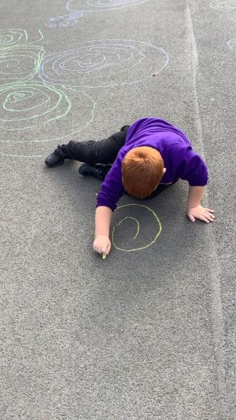 Today we explored using our whole body to create spiral drawings. We used chalk, pens, pastels and pencils to create these spiral drawings – first outside with large-scale drawings and then on paper in the classroom. We also practised making spirals to music; talking about how the music made us feel and how we could use this to create spirals that reflect our emotions and mood. We created quiet spirals and LOUD spirals!