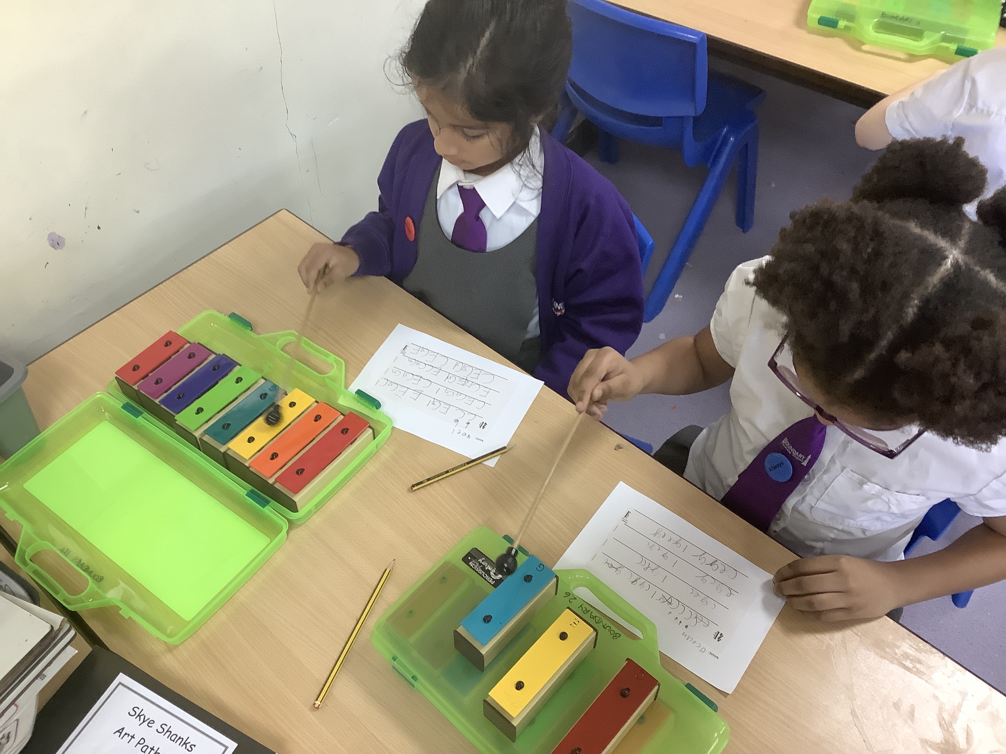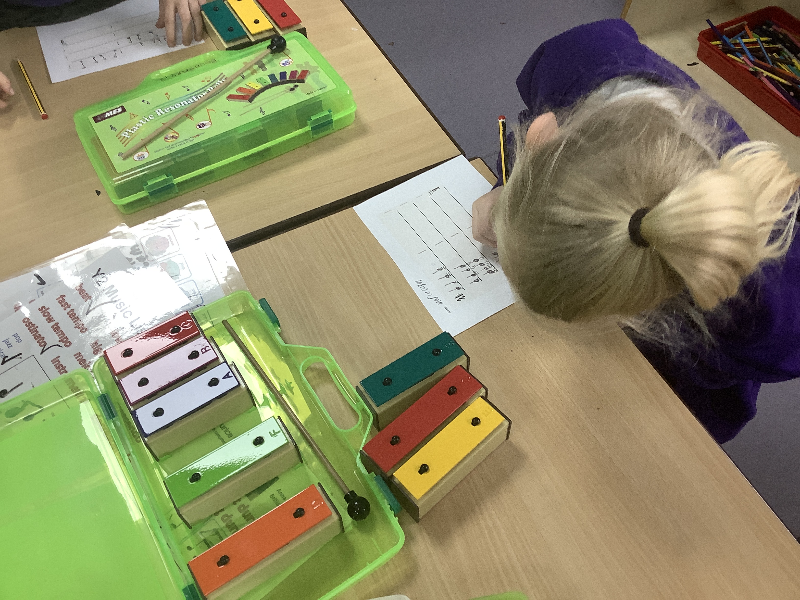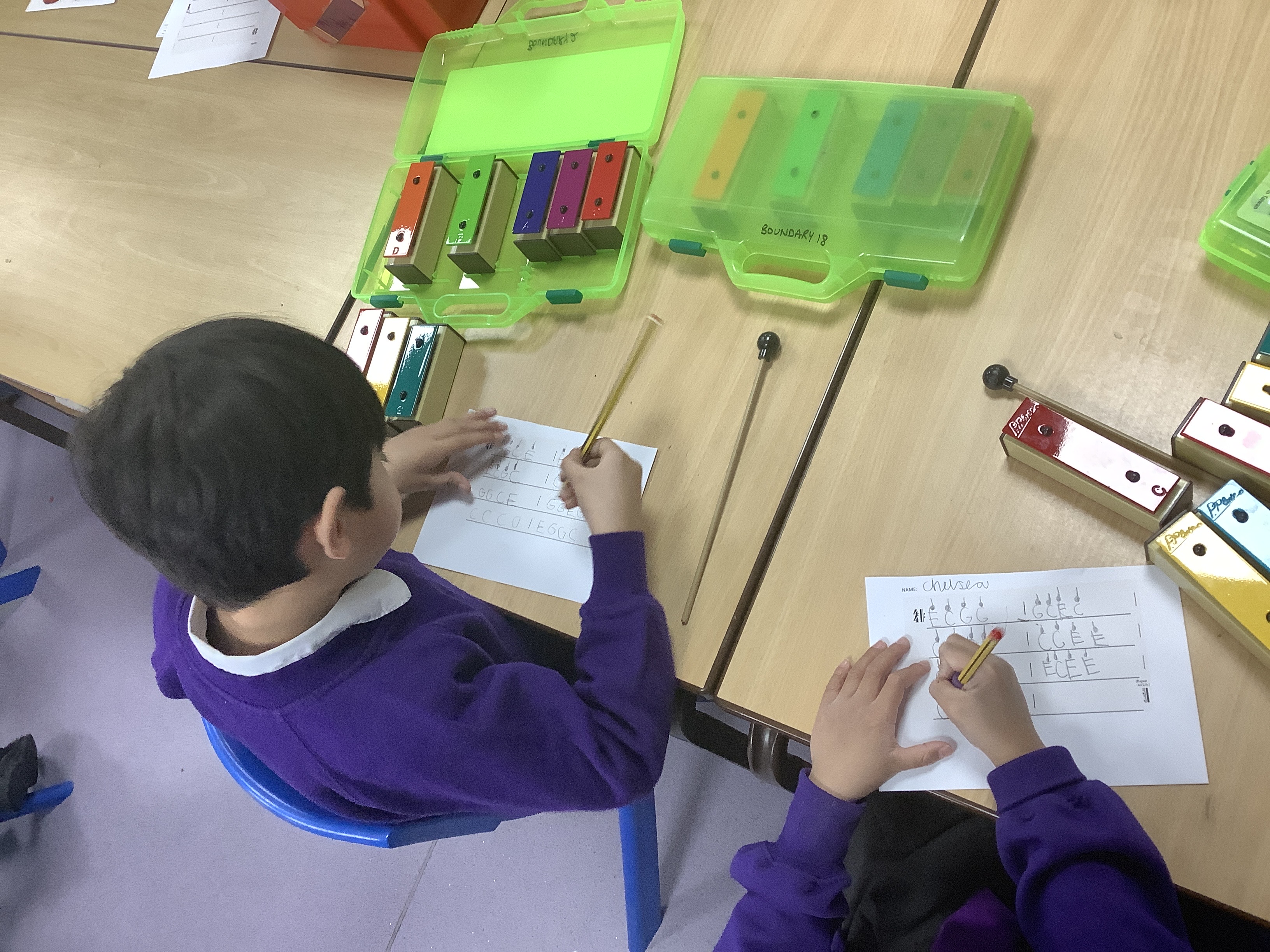 This half term in Music we have been doing lots of listening and describing using our Music Mats. We have been using appropriate musical vocabulary such as tempo, pitch, beat, rhythm and dynamics. This week we have been using the glockenspiels to compose and transcribe our own music in response to the song Helping Each Other. We have been writing down the notes and the names so that we can play it back again next week.