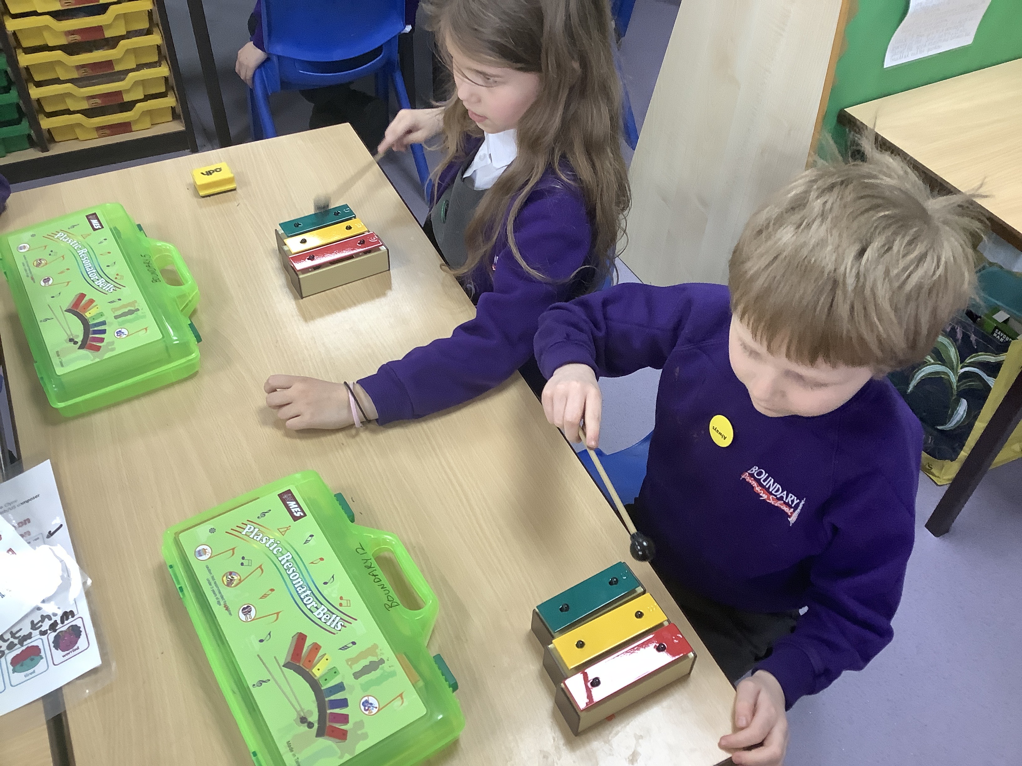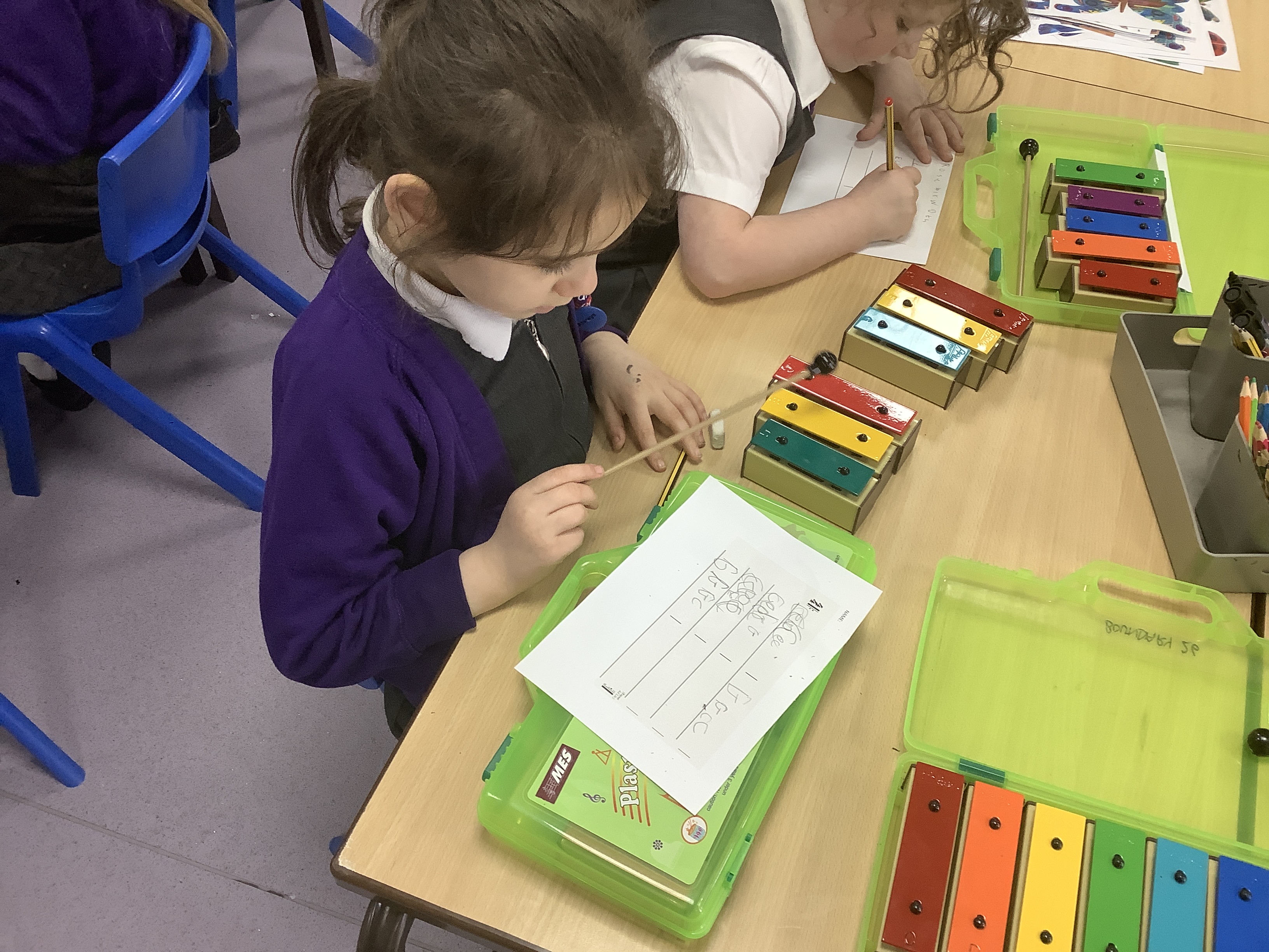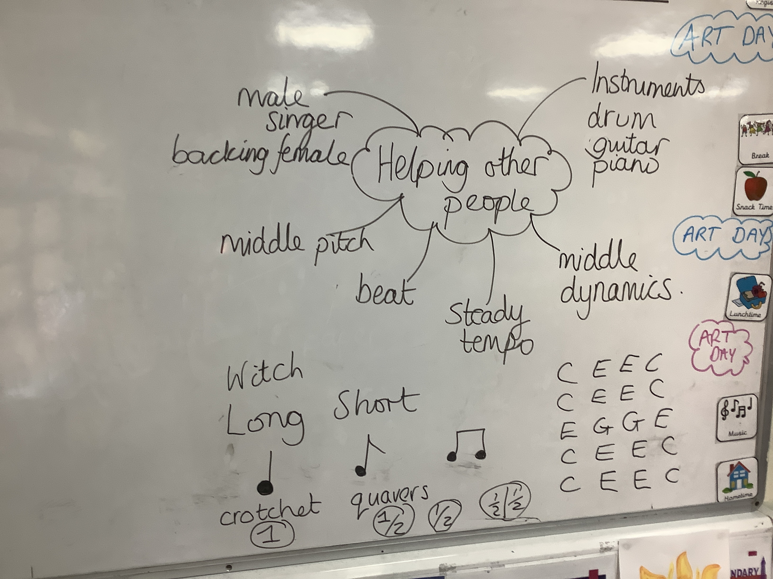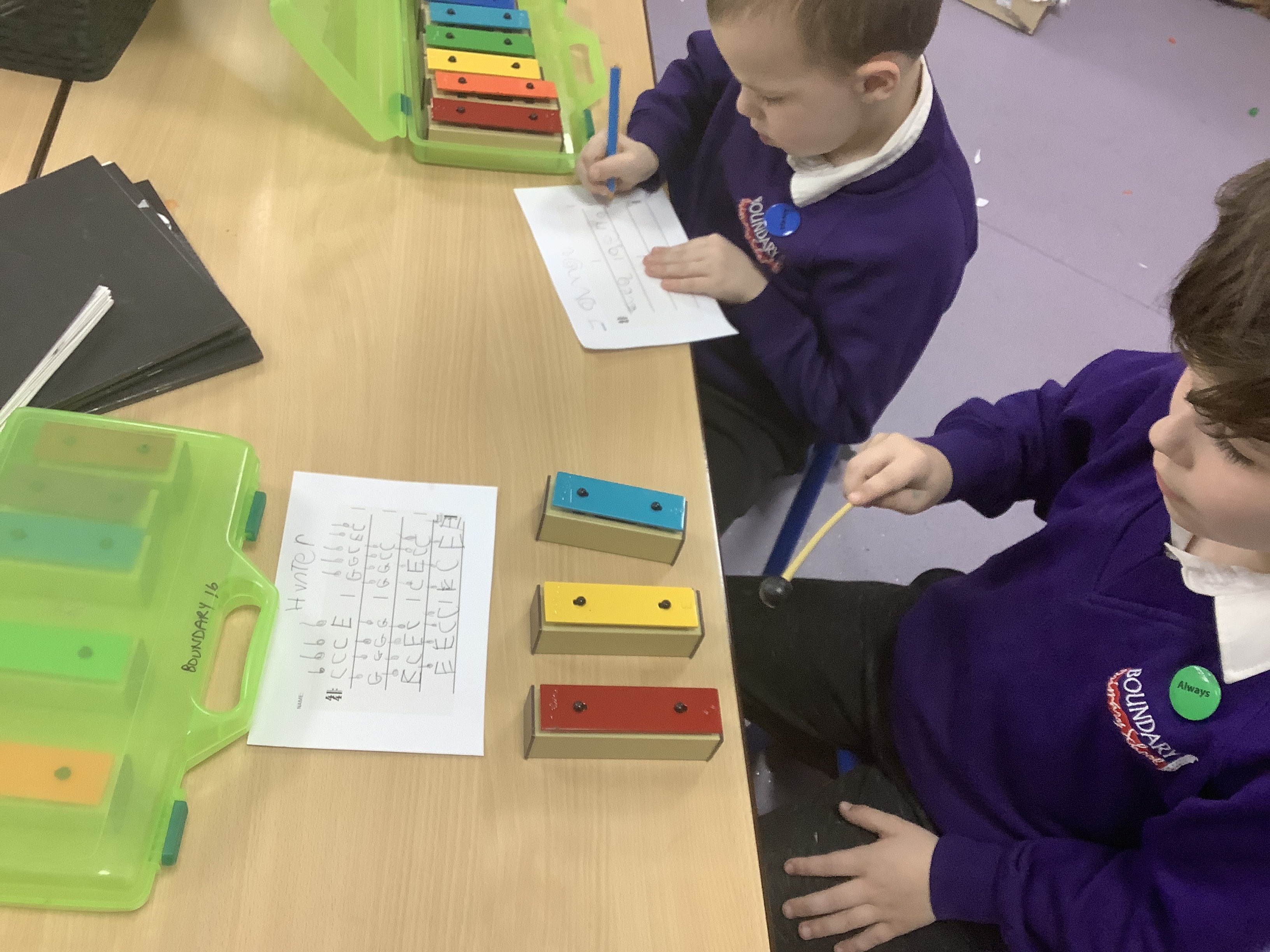 This half term in Music we have been doing lots of listening and describing using our Music Mats. We have been using appropriate musical vocabulary such as tempo, pitch, beat, rhythm and dynamics. This week we have been using the glockenspiels to compose and transcribe our own music in response to the song Helping Each Other. We have been writing down the notes and the names so that we can play it back again next week.