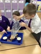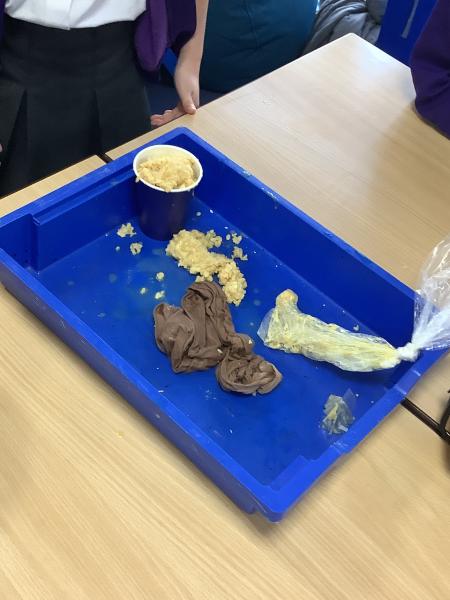 - Intestines: Then came the tights—our pretend intestines. We squeezed the mixture through, watching the liquid drip out, representing nutrients being absorbed.