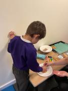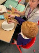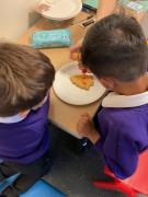 We are learning to share group resources and working alongside each other, as well as developing our focus and concentration in an adult led activity. We then enjoyed trying see pizza we made earlier.