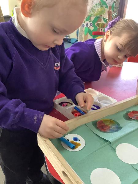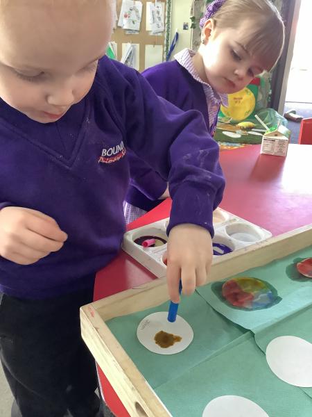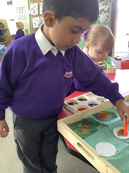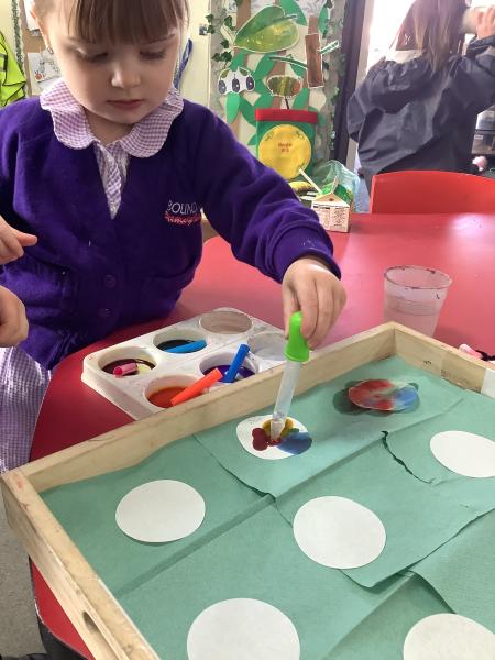 Our Nursery class enjoyed a colourful experiment exploring colour mixing using coffee filters, food colouring and water. The children watched with excitement as the colours spread and blended, talking about what they could see and predicting what might happen next.