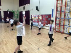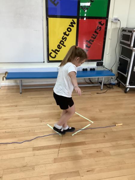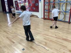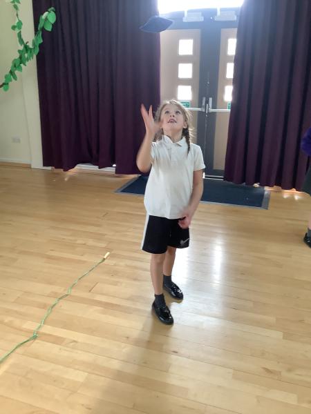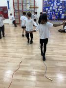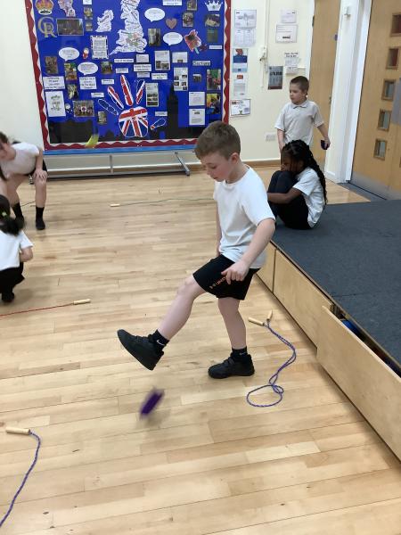 The lesson made great use of skipping ropes and beanbags. Children practised skipping to improve their fitness, before taking on a variety of throwing and catching challenges. They challenged themselves by throwing a beanbag and catching it on their foot, throwing and clapping before catching, and even walking along the skipping rope while throwing and catching the beanbag.