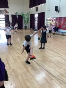 Next, the children stayed in their trios and took turns completing balance challenges, including balancing a bean bag on their head while standing on one foot, skipping and balancing, and lifting and placing a hoop. We talked about the importance of core strength and using our tummy muscles to help us balance. A great session full of effort and focus! 💪