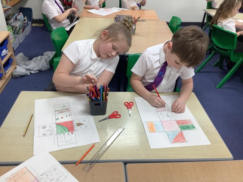 Using this knowledge, the children designed their own Christmas gift boxes, thinking carefully about the shape and size they would need. They then created their own cardboard nets, accurately measuring, cutting and folding to form their boxes. This activity helped the children to develop their practical skills and understanding of how 2D shapes can be transformed into 3D structures.