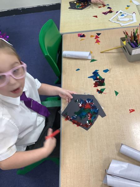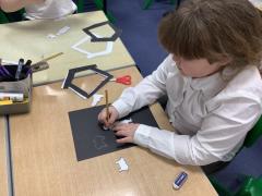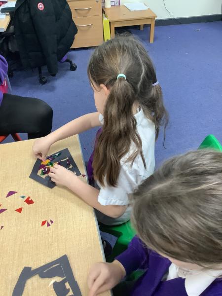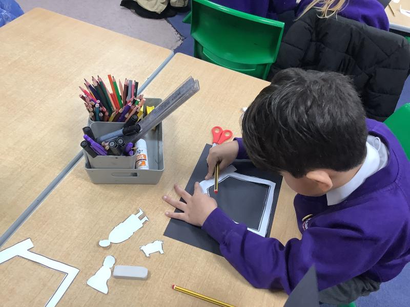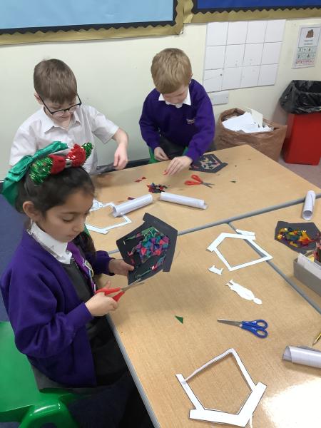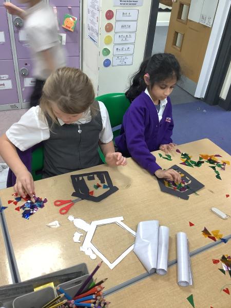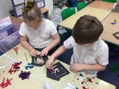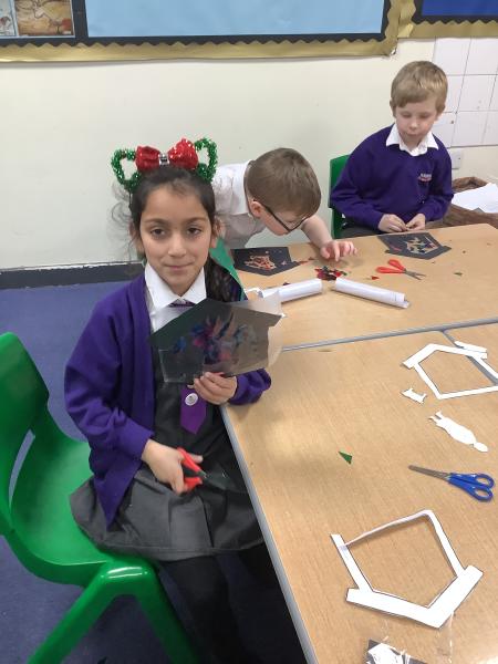 Using black card and foil, the children designed and created their own nativity scenes, carefully choosing shapes and colours to represent the Christmas story. The foil created a striking stained glass effect, especially when light shone through the finished artwork.