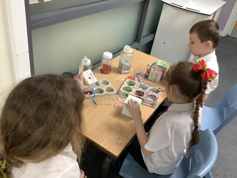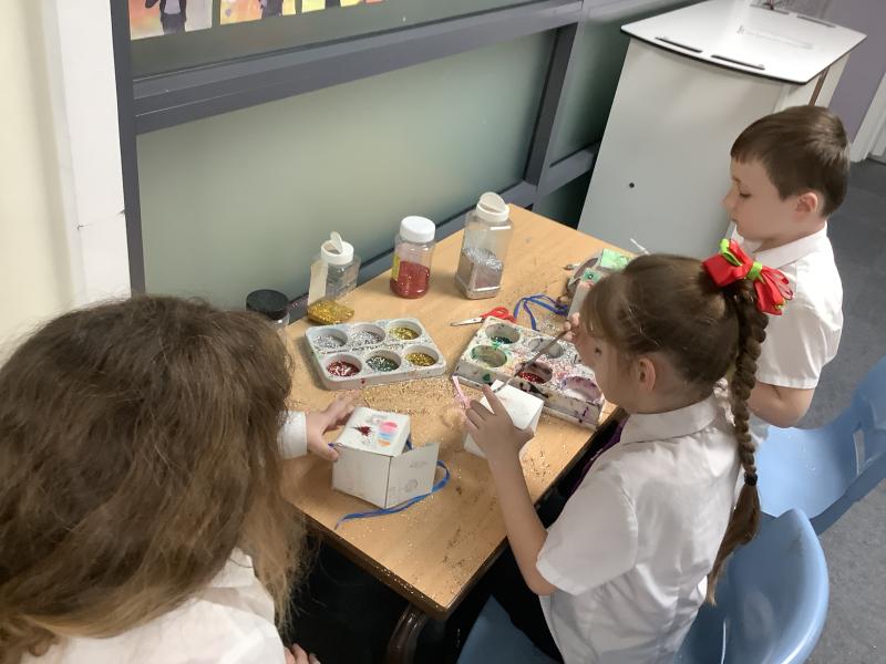 Once assembled, the gift boxes were decorated with festive designs, making each one unique. The children showed great concentration and perseverance throughout the process and were very proud of their finished boxes.
