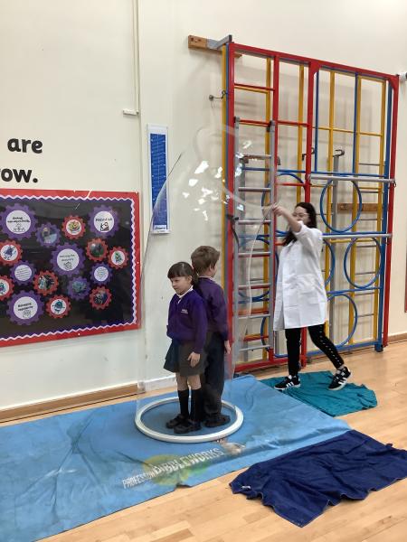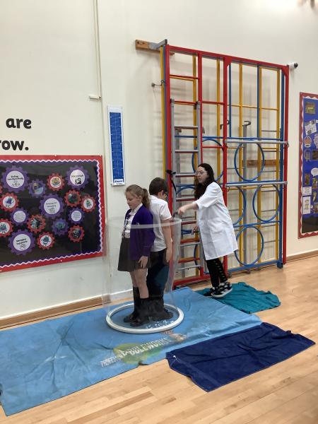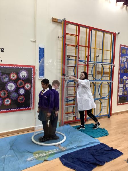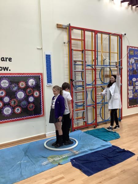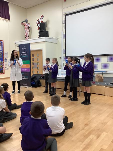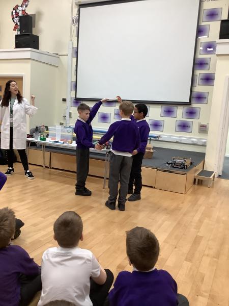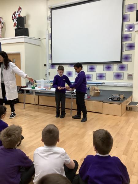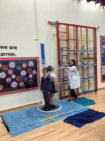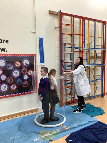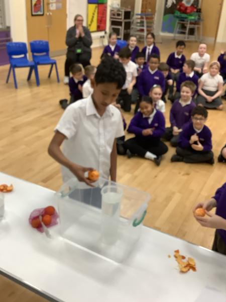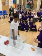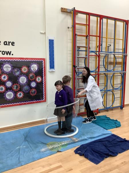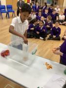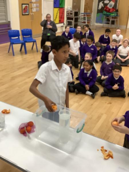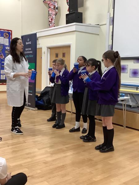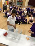 Afterwards, we went to a workshop in the hall where we took part in lots of different experiments with Rebecca. The first thing we looked at was circuits and how if a circuit breaks then our lights/buzzers wouldn’t work. Then we had a physics challenge where we had to use blowing to remove a cup from a stack. Afterwards, we used physics again to create a tornado type effect to get a sunken satsuma from the bottom of a water filled jug to the top.