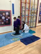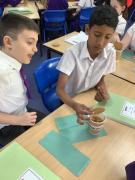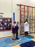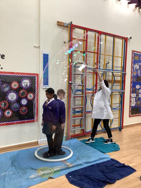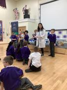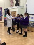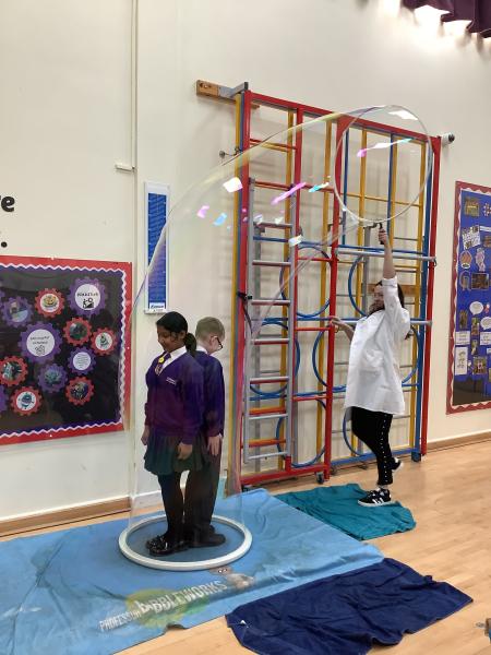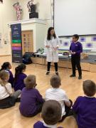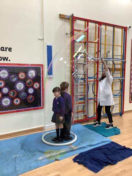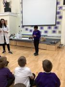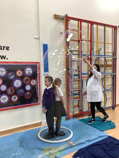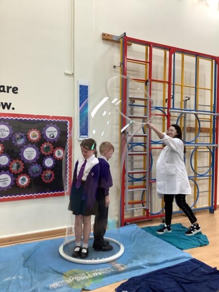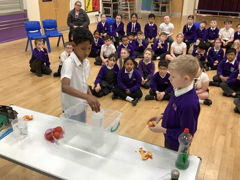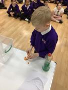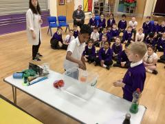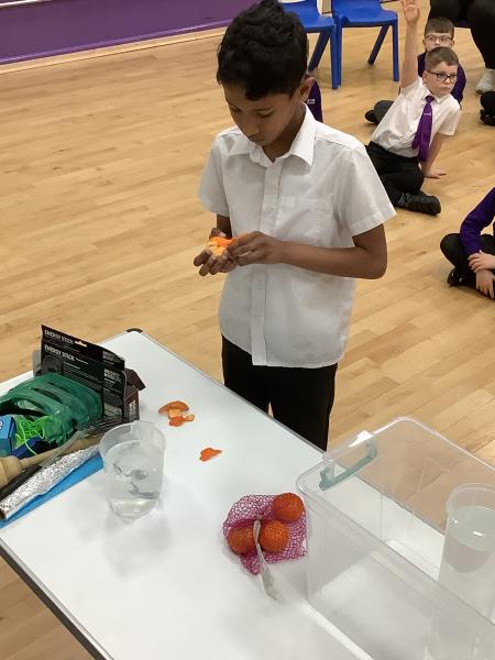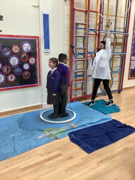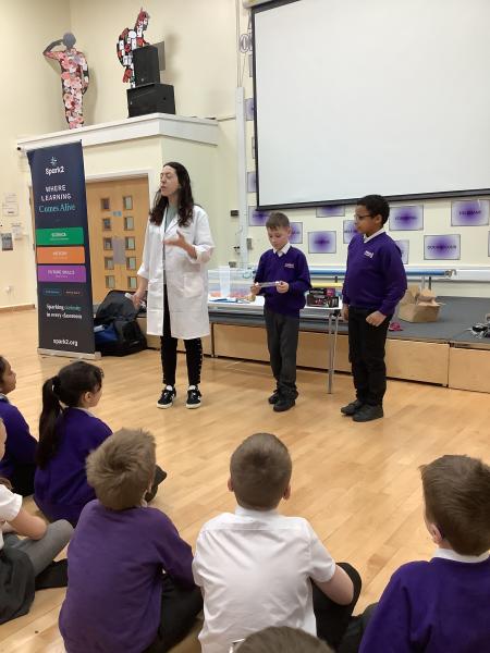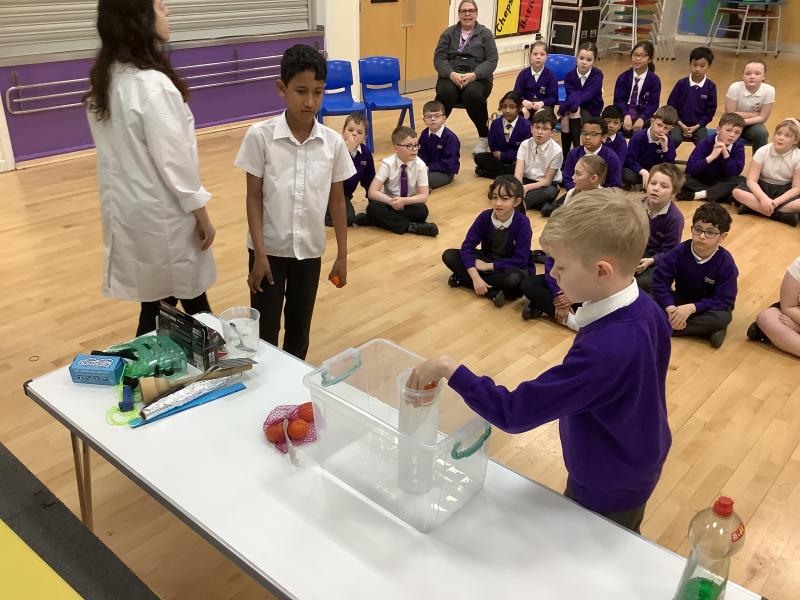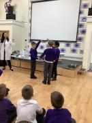 Afterwards, we went to a workshop in the hall where we took part in lots of different experiments with Rebecca. The first thing we looked at was circuits and how if a circuit breaks then our lights/buzzers wouldn’t work. Then we had a physics challenge where we had to use blowing to remove a cup from a stack. Afterwards, we used physics again to create a tornado type effect to get a sunken satsuma from the bottom of a water filled jug to the top.