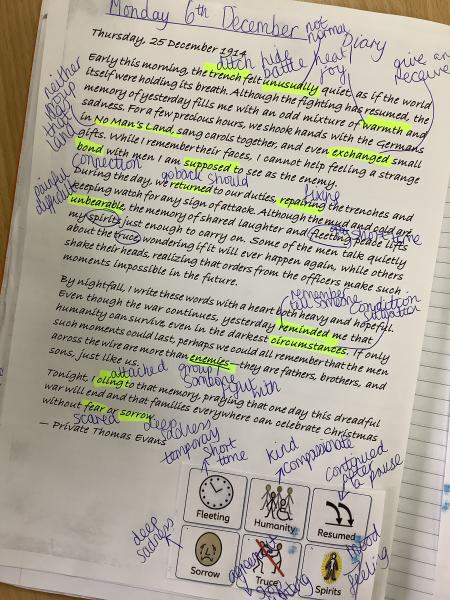Year 5 have been learning about the Christmas Truce during World War I. We explored a diary entry written by a soldier and discussed the events and emotions described. As part of our work, we focused on developing our vocabulary, looking closely at words such as fleeting, truce, and sorrow to deepen our understanding. We also spent time imagining what life might have been like for soldiers spending Christmas on the front line—considering the harsh conditions, the mixed feelings they experienced, and the significance of the brief moments of peace and humanity during the war.
