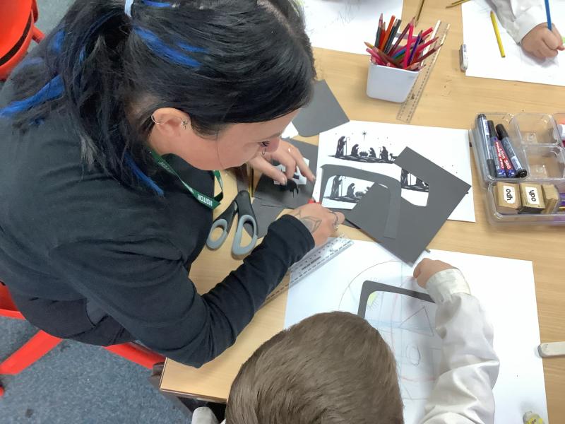 Today, we used our knowledge of Christianity to produce a picture of the key characters in the nativity. We used silhouettes on a colourful background to make the characters stand out and create a stained glass effect. We then used silhouettes of Mary, baby Jesus, Joseph and the star shining brightly above the manger.