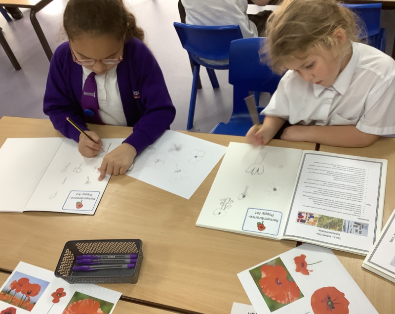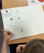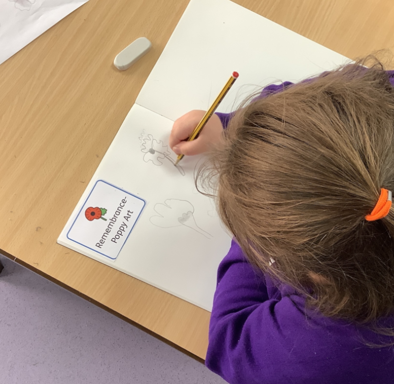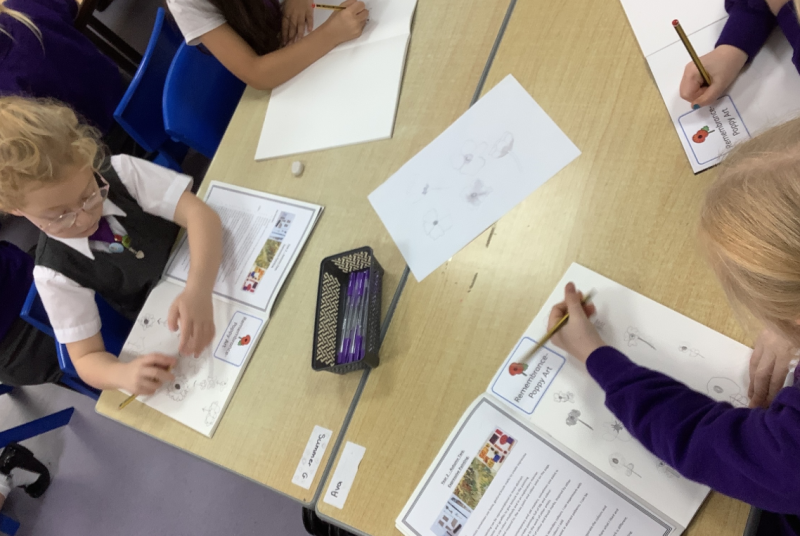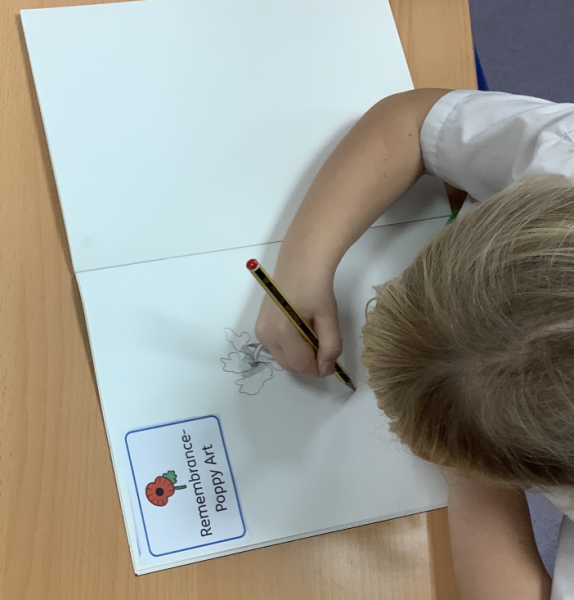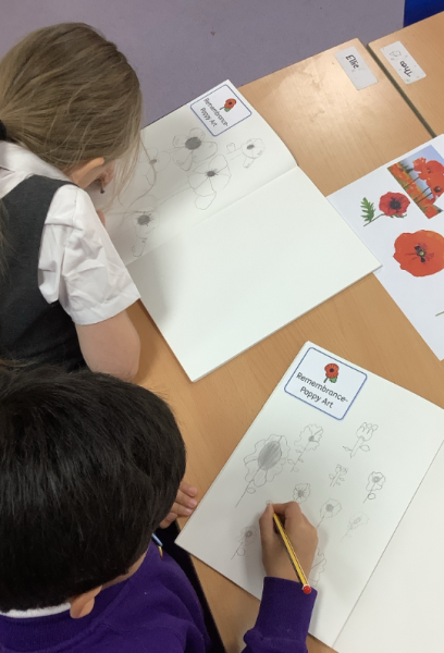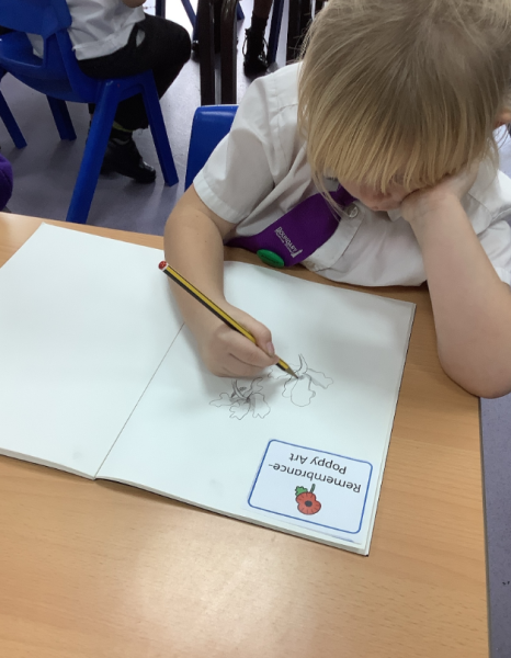 In Art, Year 2 have been exploring expressive drawing linking it to our Remembrance service. We did observational drawing of poppies thinking about the shapes and shadows we could see.