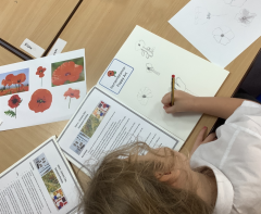 Children in Year 5 have been looking at Remembrance and have learnt more about why the Poppy is a symbol of remembrance. They have then sketched poppies in a variety of styles and using a range of different techniques. Their final piece will be sketched onto battle field maps, flight plans or plane diagrams from World War 1 and 2. The children have also been busy making poppies that have the name of a soldier that they will keep in their thoughts when they plant them during our whole school act of remembrance on Tuesday 11th November.