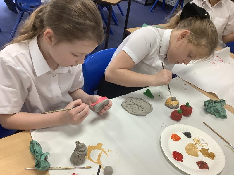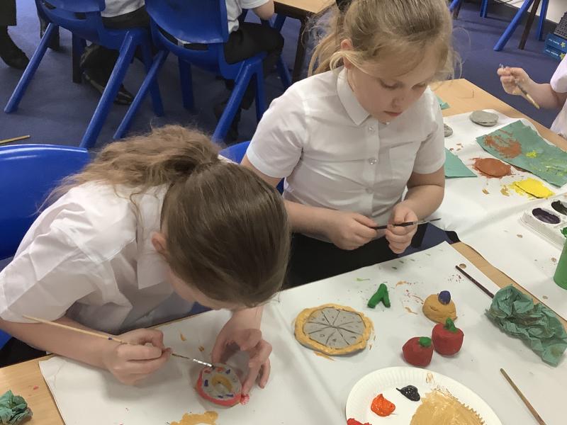 Year 4 pupils completed their Festive Feasts sculptures by adding colour and detail using acrylic paint. After carefully shaping their clay food models in the previous lesson, the children focused on making their creations look as realistic as possible. They thought closely about colour mixing, shading, and small details such as texture and pattern to bring their food to life.