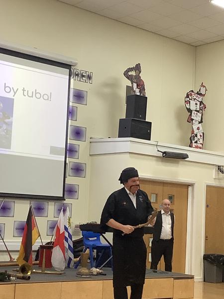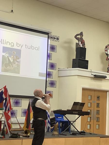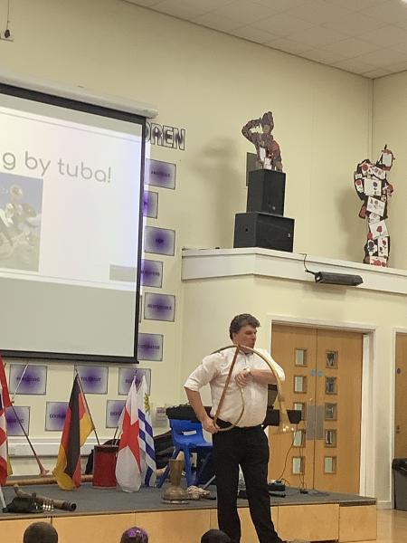 Pupils were taken on a musical journey around the world, encountering remarkable instruments such as the Chinese dragon‑headed trumpet, the Swiss alpine horn and giant Tibetan dungs. The children were amazed by their size and unique sounds, and the duo’s lively delivery kept everyone thoroughly entertained.