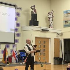 This morning, Year 3 enjoyed an energetic and engaging musical assembly from the Travelling by Tuba duo. Designed to inspire pupils across the primary range, the session delivered exactly that. The performers introduced a fascinating collection of unusual wind and brass instruments—many completely new to the children—and filled the hall with humour and captivating storytelling.