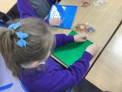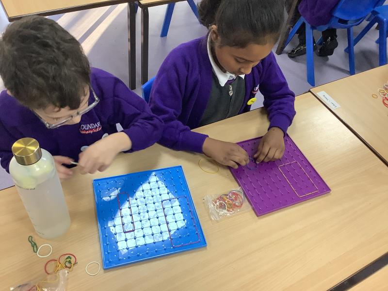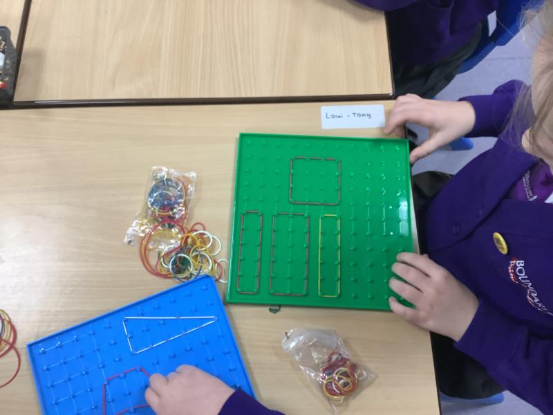 In this maths lesson we were looking at drawing 2-D shapes. Firstly we recapped our learning on vertices and sides and thought about regular and irregular shapes. The children then used the Geoboards to firstly make different shapes and then used dotted paper to draw the shapes.