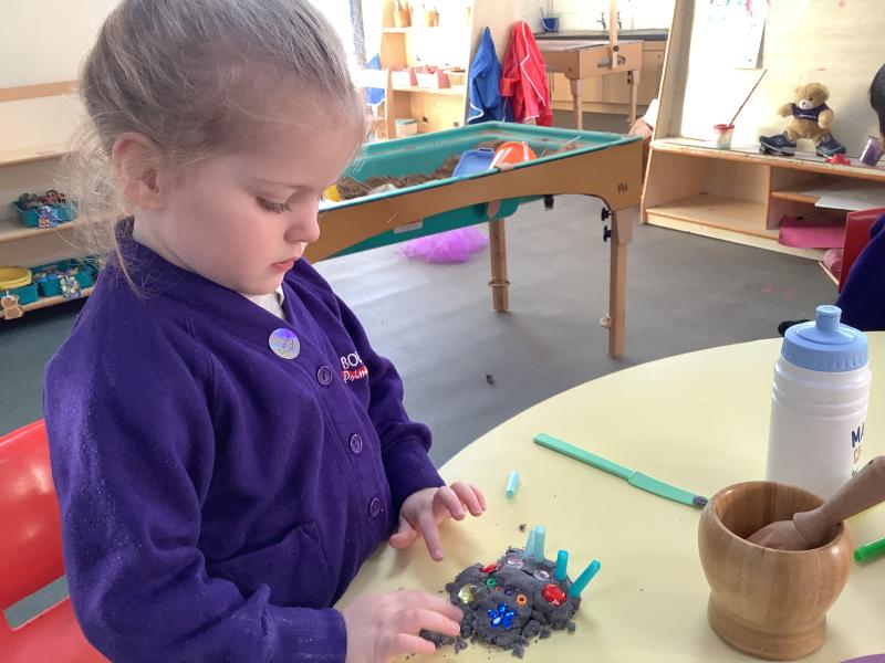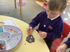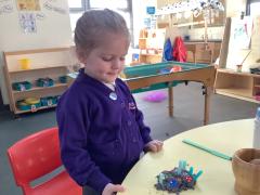 We are reading the story "We're Going on a Bear Hunt" by Michael Rosen and have had lots of fun bear activites in our provision. The children really engaged with our bear sensory tray amd created some great bear bottles by filling them with coco pops. This was great for their fine motor development as they scooped up coco pops are carefully poured them in to the different size bottles. As the childen filled the bottles we counted how many scoops and used mathmatical langauge including full, empty, bigger and smaller.