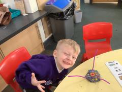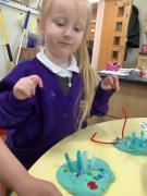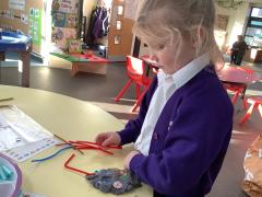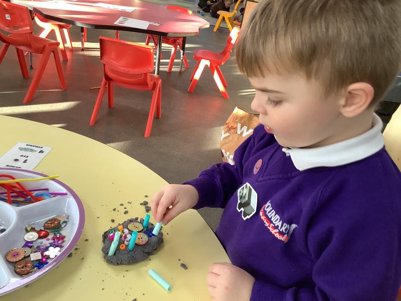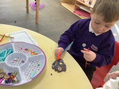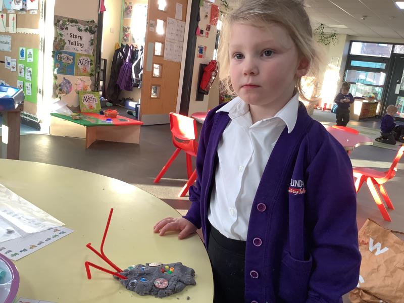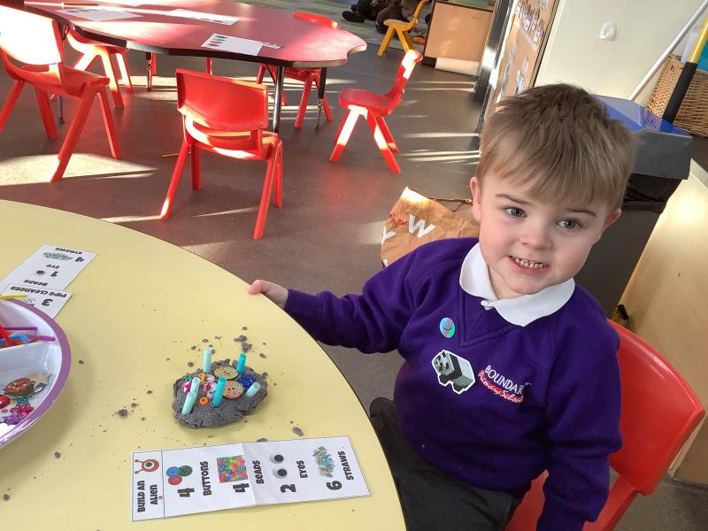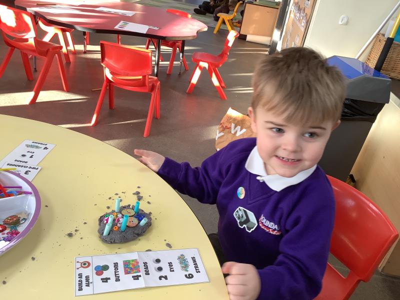After reading the story "There's an Alien in your Book" the childlren followed instructions to create their own Aliens. They had to select the right amount of buttons, beads, eyes and pipe cleaners and then chose how to arrange then to create their alien.