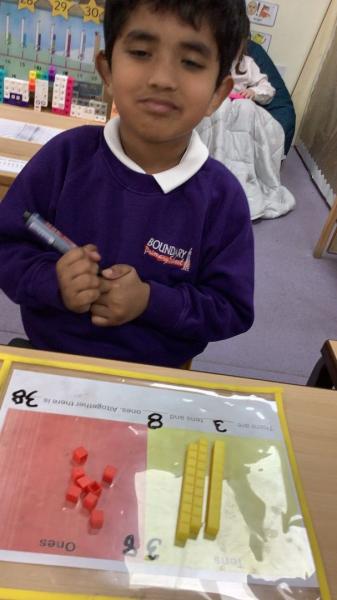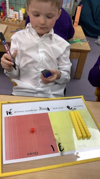 This week, in maths we used base 10 to understand place value of tens and ones within 2-digit numbers. We used the stem sentence ‘there are ___ tens and ___ ones. Altogether there is___. We looked at how tens are grouped to understand the place value.