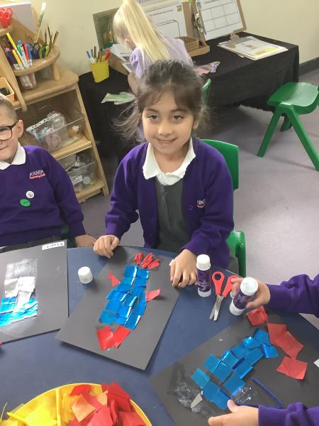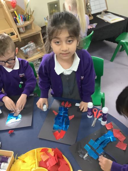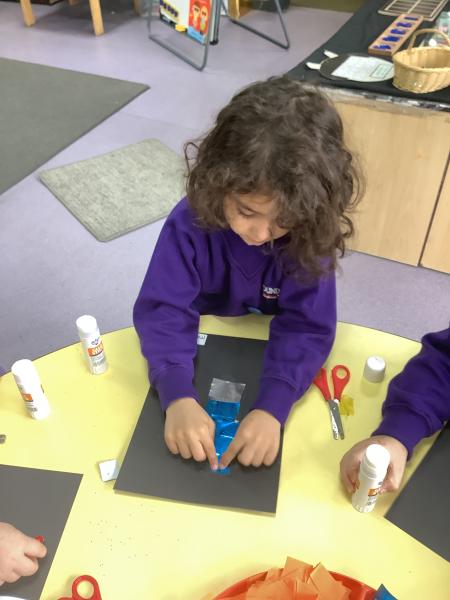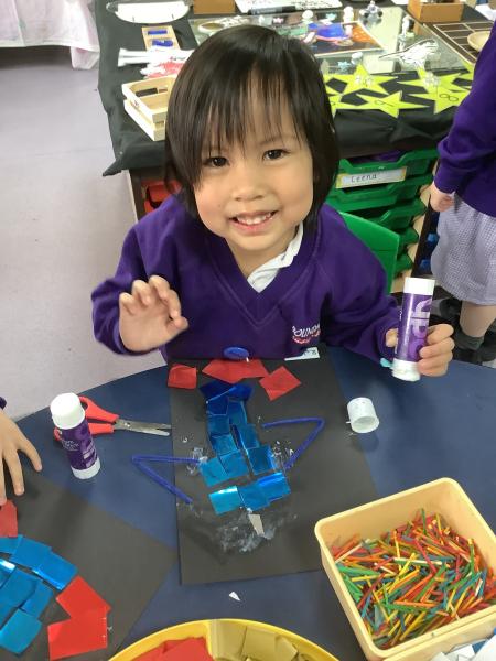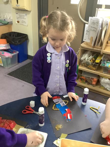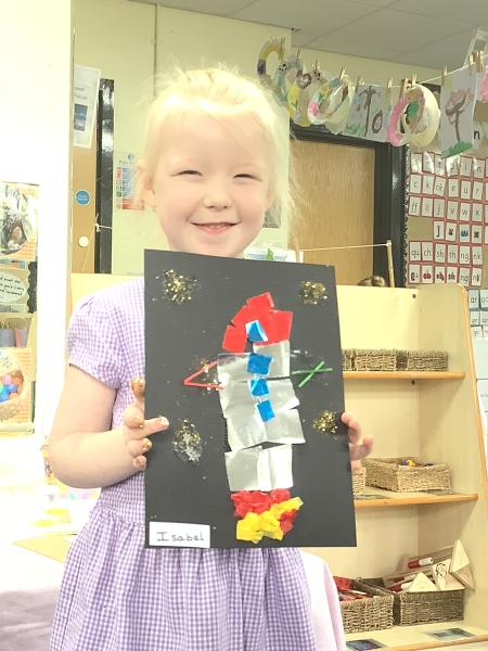 This week the children enjoyed a creative learning experience in the creative area, where they designed and collaged their own space rockets using a wide range of materials. They explored different shapes textures and colours, selecting and combining resources such as paper, card and foil with care and creativity. This activity encouraged the children to think carefully about shape and structure, supporting early mathematical understanding while developing fine motor skills and hand–eye coordination. The openāended nature of the task allowed each child to express their ideas freely, resulting in a variety of imaginative and unique designs. Throughout the activity, children demonstrated focus, independence and pride in their work, while confidently talking about the shapes they had used and the choices they had made.