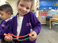 The children also counted how many pieces of pasta they used, combining creativity with early maths skills. They were very focused and proud of their colourful caterpillar necklaces — well done, Nursery!