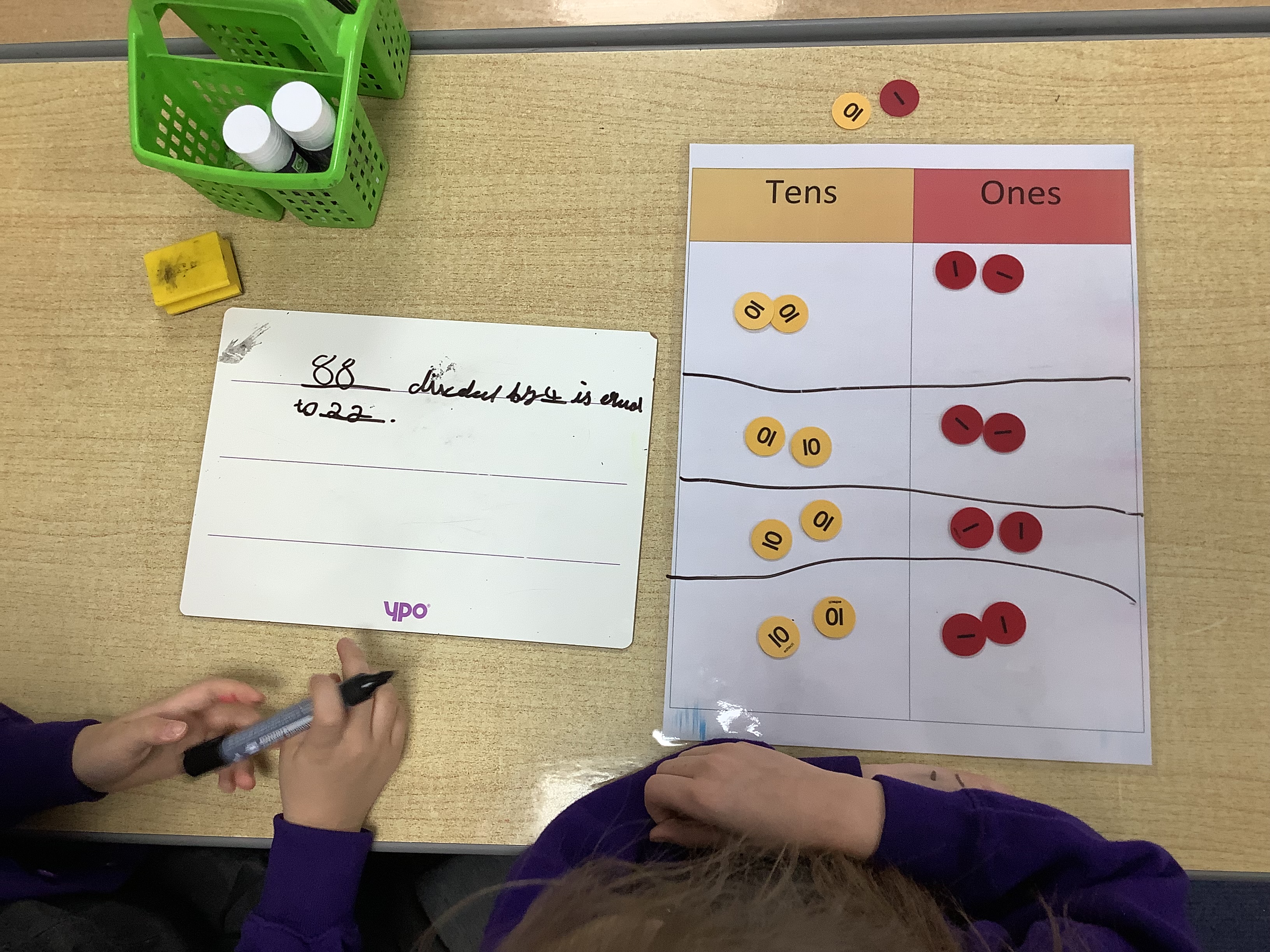 In this first lesson we looked at dividing a 2-digit number by a 1-digit number. The children looked at dividing with no exchanged. We used the stem sentence — divided by — is equal to —.