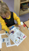 The children were introduced to a range of different vocabularly and practised building sentences orally. They then enjoyed going outside into the outside area and becoming a firefighter. They responded to emergencies from 999 phone calls, drove their fire trucks and even put out fire using their hoses.