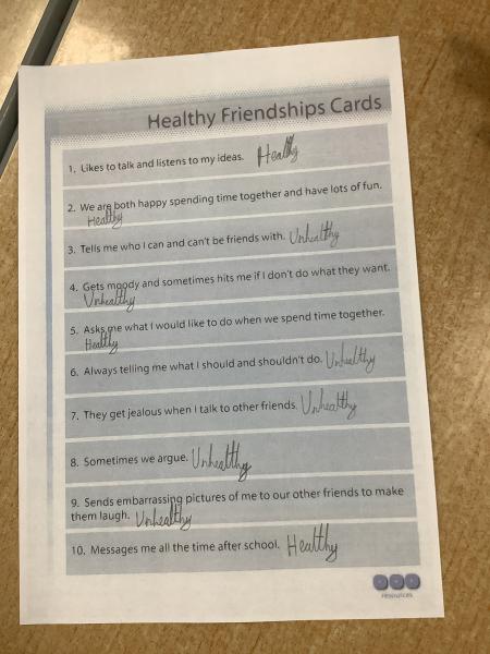 During our third RSE lesson this week, we looked at what a healthy relationship looks like. To start, we discussed what a friendship is and what makes a good friend. Then we looked at statements and pictures about/of friendships and we had to decide whether it was an example of a healthy relationship or not.