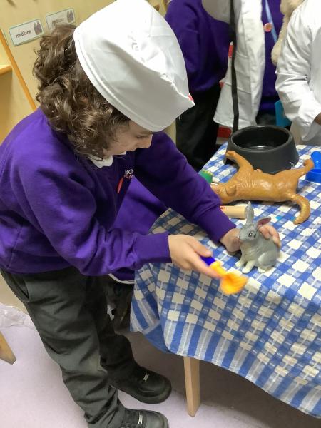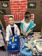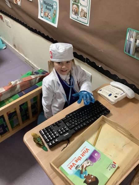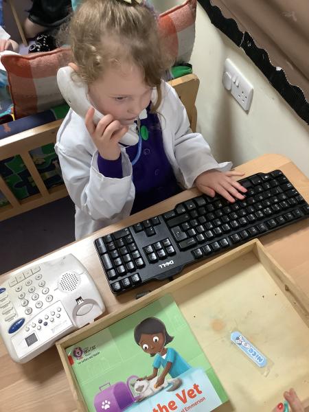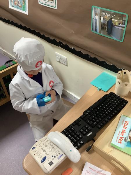 As part of the experience, the children have been using new vocabulary linked to the topic such as appointment, patient, injury, treatment, stethoscope. They have been taking turns speaking and listening, especially when deciding what is wrong with an animal and what treatment is needed and have also been answering the phone in role—using set phrases like “How can I help?” or “Would you like to book an appointment?” They worked together taking turns and sharing resources at the same time as learning about a possible future career and how vets help care for animals.