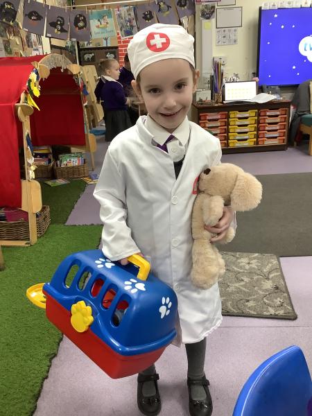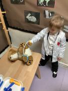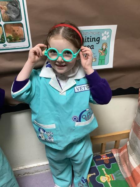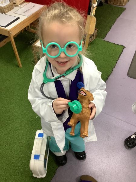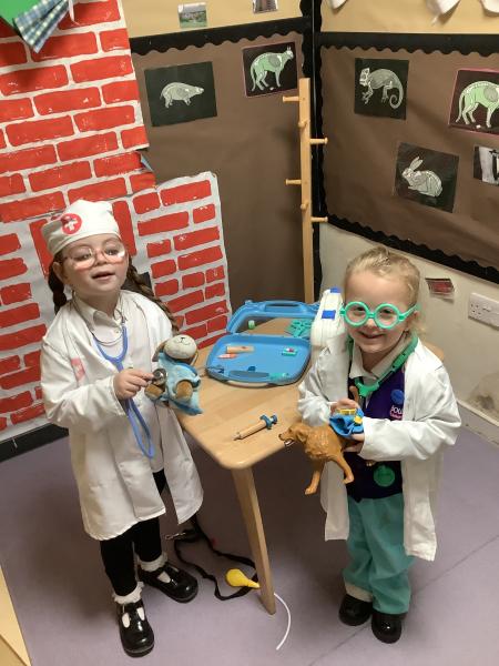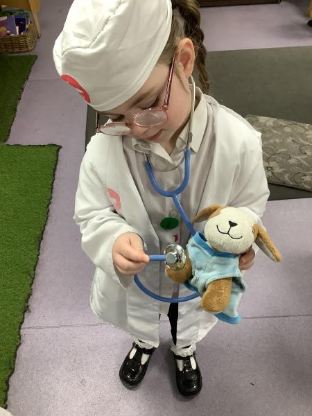 The children have been exploring our Veterinary Surgery role‑play area, where they have been busy tending to poorly and injured animals. They have enjoyed dressing up as vets, nurses and receptionists, using real‑life objects such as bandages, stethoscopes, clipboards and appointment cards to bring their play to life.