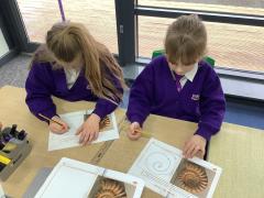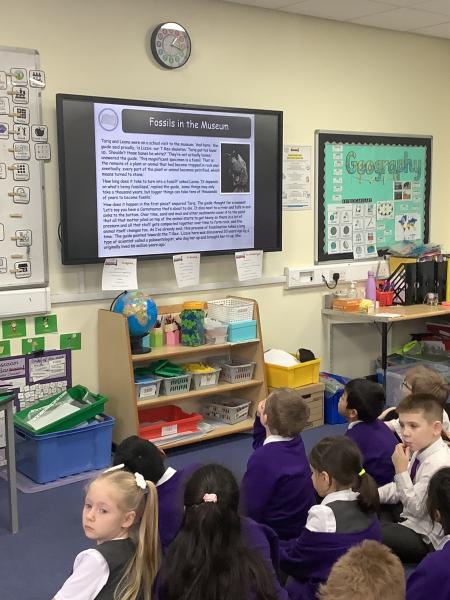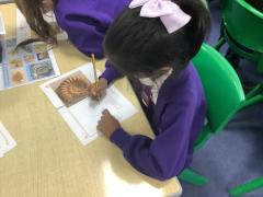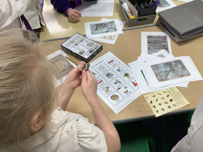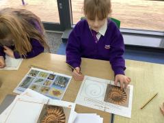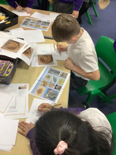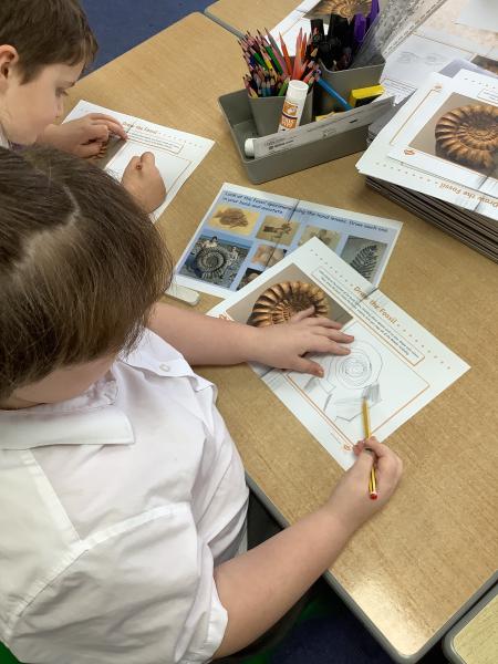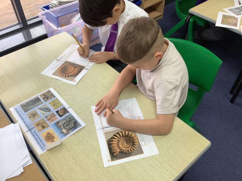 In our science lesson this week we learned about fossils. Fossils are the remains or marks of plants and animals that lived a very long time ago. We looked at pictures of fossils and some real fossils to see what they look like. We learned about fossilisation, which is how fossils are made. When a plant or animal dies, it can be covered by mud or sand. Over a very long time, more layers build up and press down hard. Water with tiny minerals moves through the layers and slowly turns the bones or shells into rock. This takes millions of years. We also ordered the steps of fossilisation to show we understood the process. To finish the lesson, we drew our own fossils, showing what plants or animals from the past might look like when they are preserved in rock.