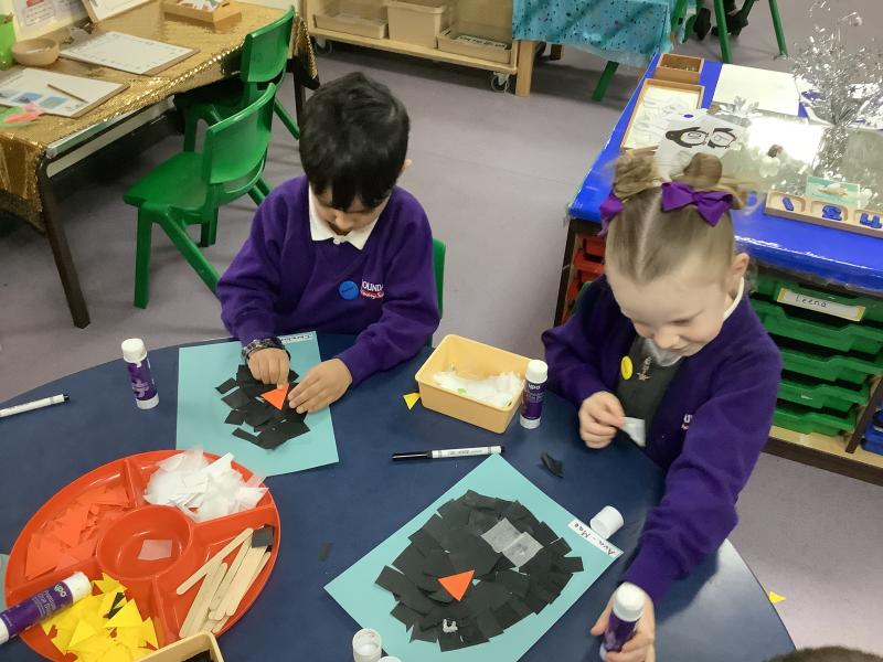 Nursery have been learning all about winter this week. We have have read the story "snowball" by Sue Henra and talked about cold, snowy weeather. The children were challenged to make a snowman out of playdough using two different sized cutters. They have also explored ice and found different ways to make it melt and investigated some fake snow in the tuff tray. To get their creative brains working, the children made some collage snowmen adding two eyes, one nose and mouth.