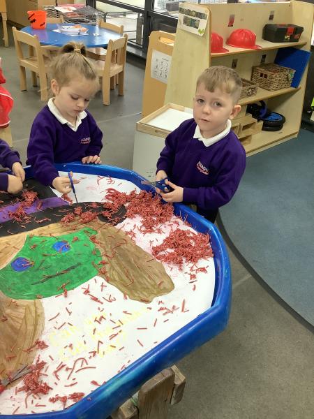 The children are becoming very famialir with the story "We're Going on a Bear Hunt" and loved creating marks to represent parts of the story using differernt brush strokes. The children repeated words from the story as the made the marks "swishy swashy", "splash splosh", "squelch squerch", "stumble trip" "hoooo wooo".