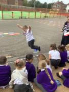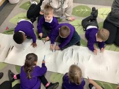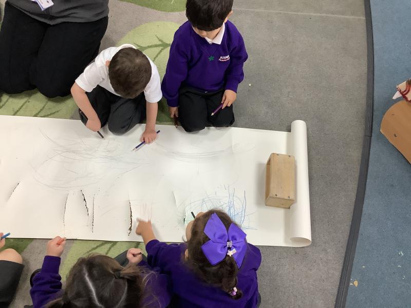 Nursery follow the "Squiggle While You Wiggle" programme to support the development of their gross motor skills. Part of this is to do a series of movements on paper using a pencil in both hands. This terms movements have been "up, down, side, side, cross over". This is always done on a large scale and will eventually help the children to hold a pencil correctly and form letters.