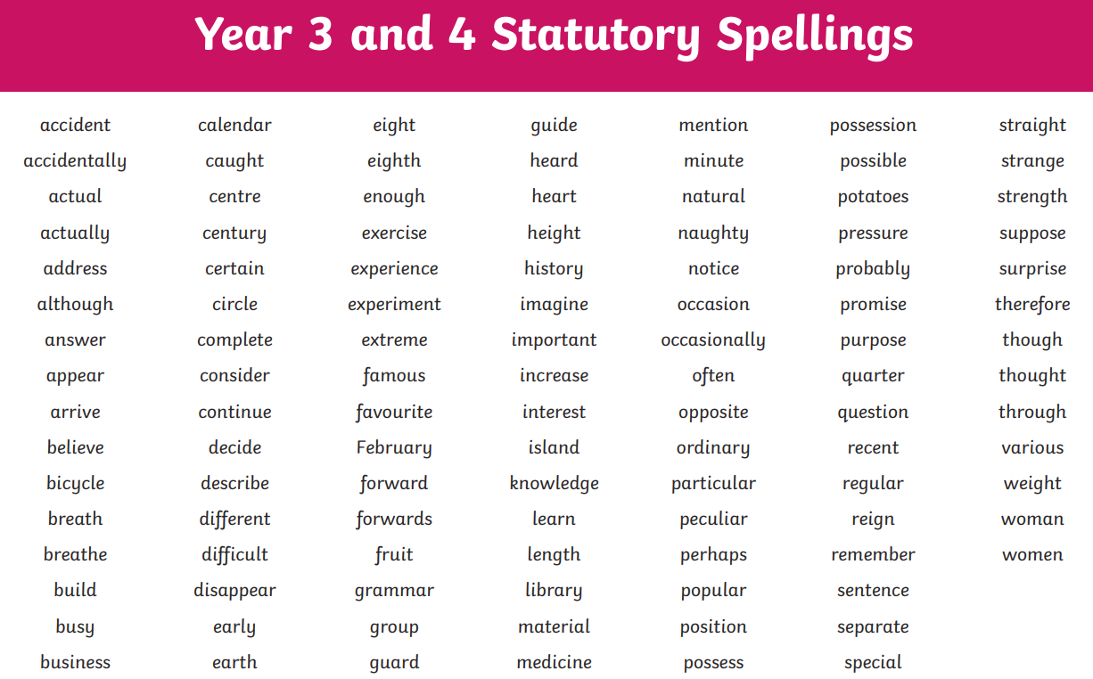 - Year 3/4 statutory words are attached for you to practise spelling throughout the year